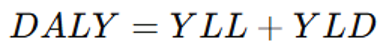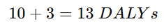 For example, if a person dies 10 years earlier than expected due to cancer (YLL = 10) and lived with severe disability for 5 years (disability weight = 0.6, so YLD = 5 × 0.6 = 3), the total DALYs lost would be: